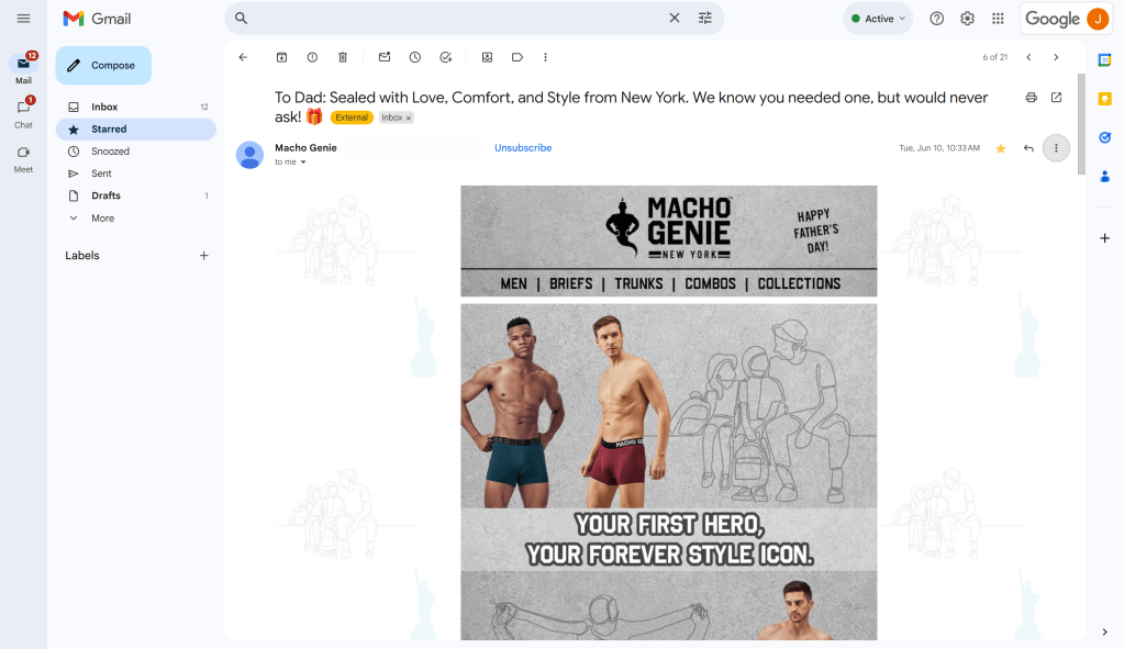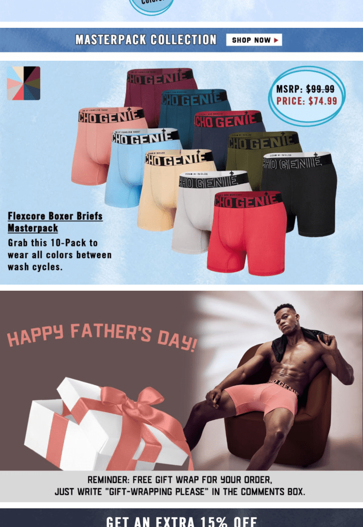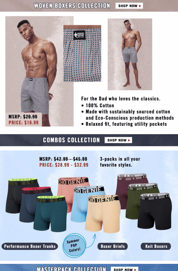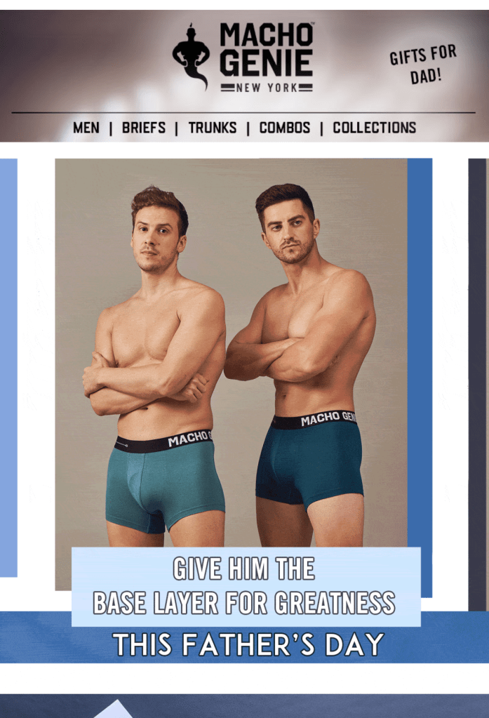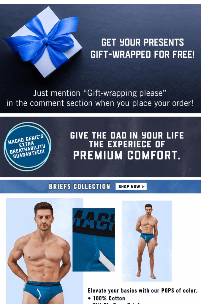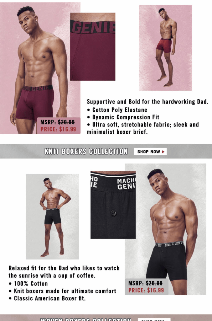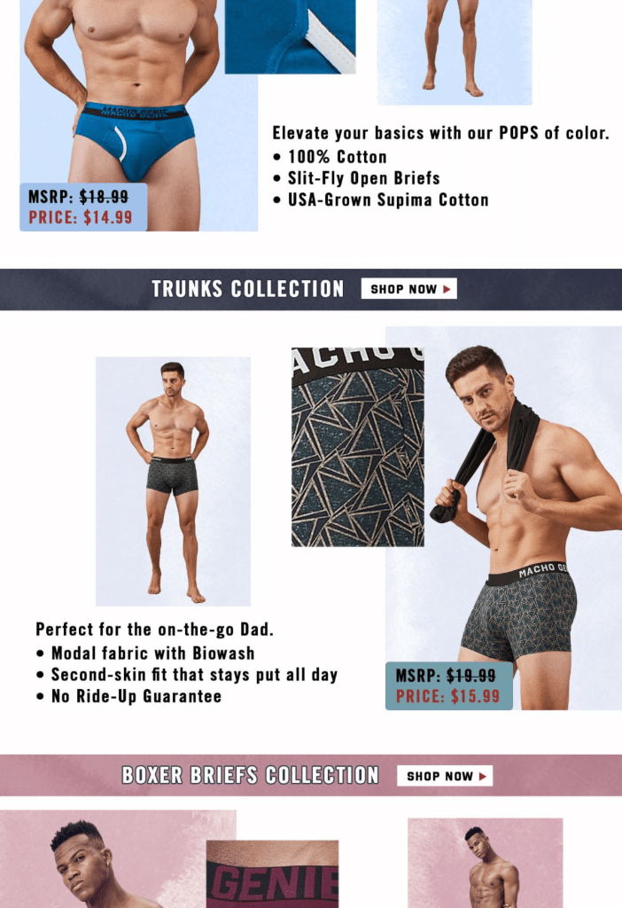 For Macho Genie, a start-up men’s underwear brand, I created multiple assets including Email Newsletters (via ConstantContact), Meta Ads, Social Media Posts, Blog Visual Content, Static Images for Web Pages, and a Product Catalogue, called a “Look Book”.